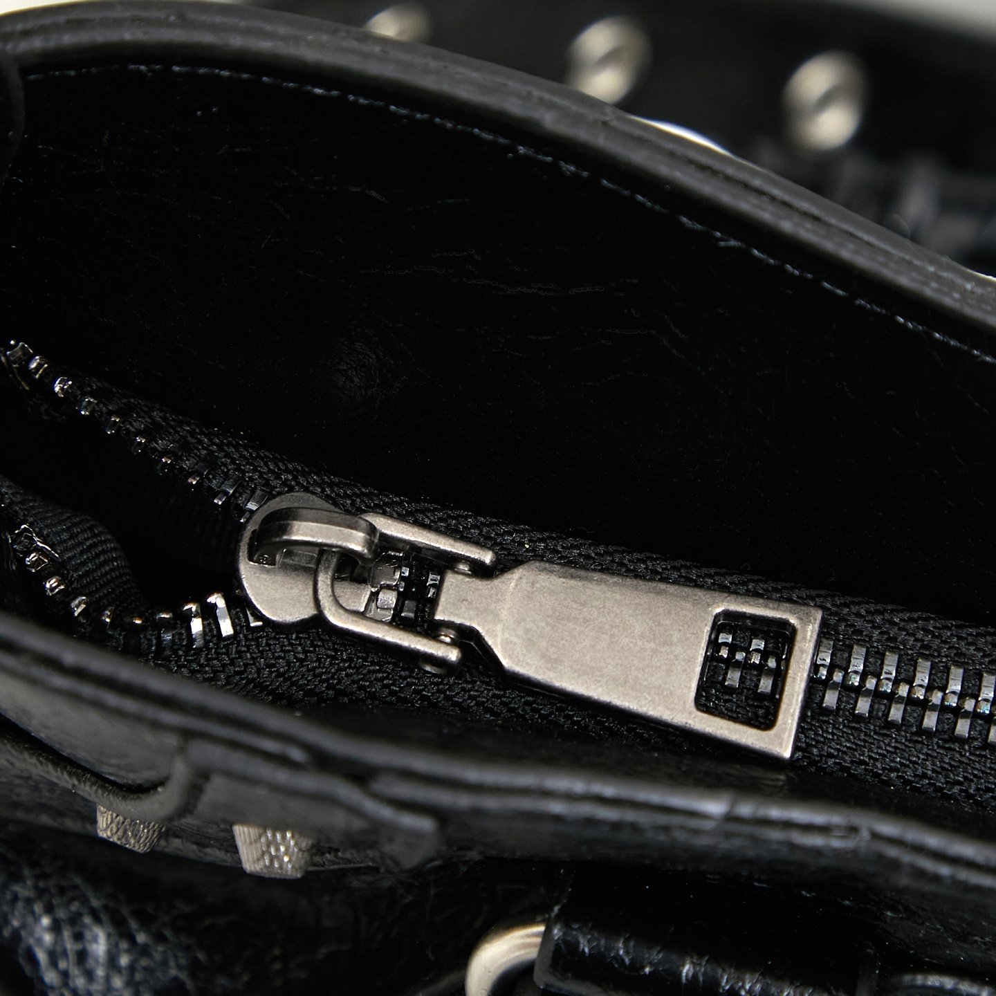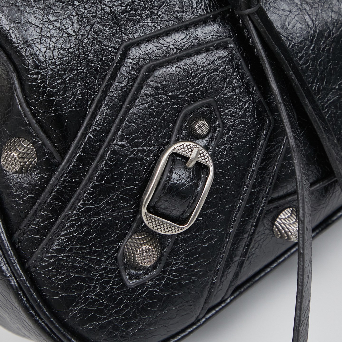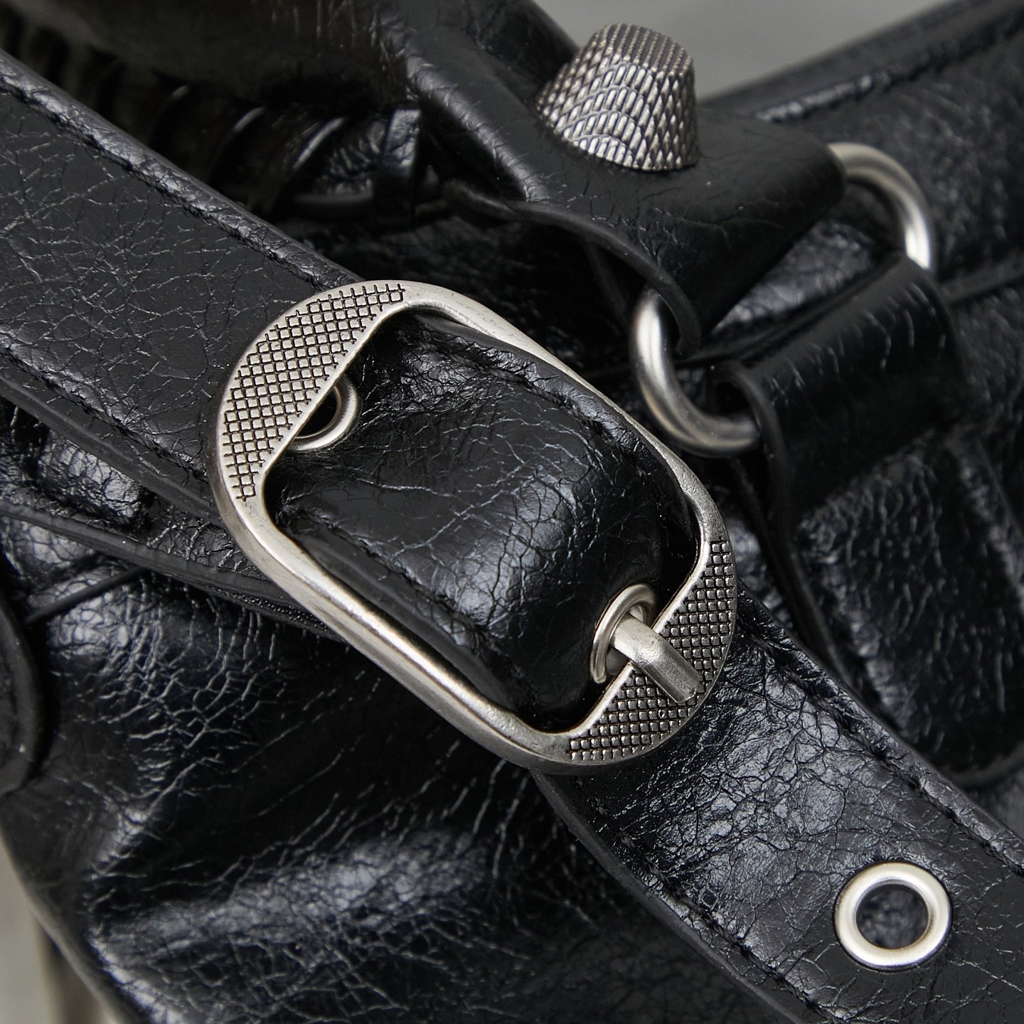 The irregular cracked pattern of waxed leather is matched with a large number of hardware accessories.