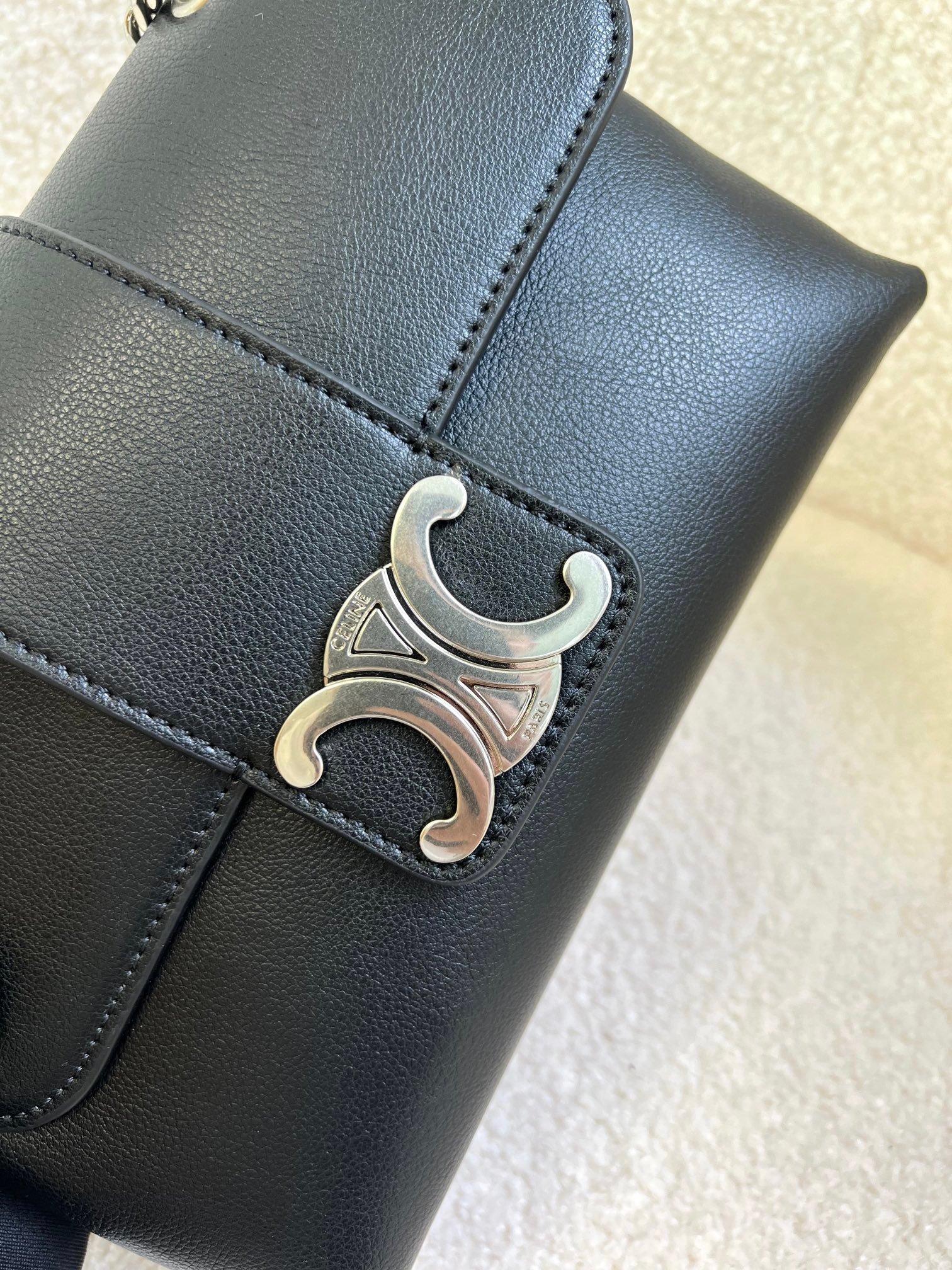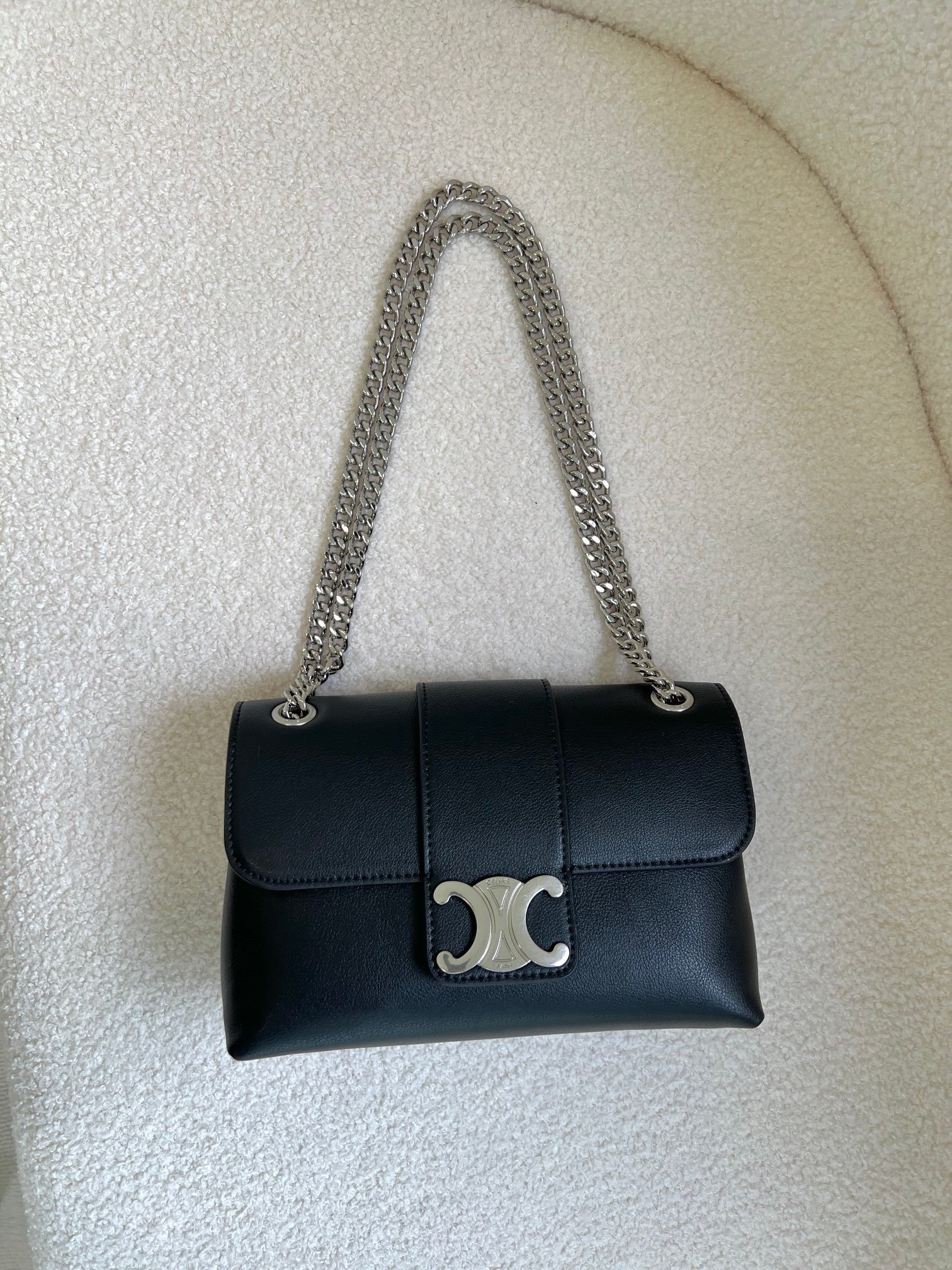 The newly released Victoire chain bag is crafted with textured leather to create a square silhouette and is paired with a golden sliding chain shoulder strap, exuding the style of a Tomboy cool girl. Another Tily handbag features a playful crescent silhouette that sets off the Triomphe emblem, revealing the sweet charm of a girl next door.