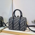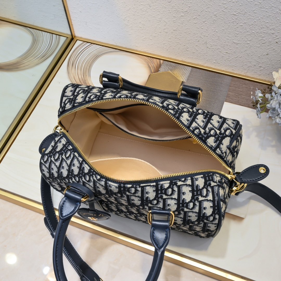 This Dior Groove .25 handbag, part of the winter ready-to-wear collection designed by Maria Grazia Chiuri, is both elegant and stylish. Crafted from blue Oblique-patterned fabric, it features a leather key pouch adorned with the Christian Dior Paris logo and embellished with gold-tone star accents. The key opens the zip-lock closure, and the spacious compartment includes a slip pocket and a zip pocket, perfect for storing daily essentials. It comes with a leather top handle and an adjustable, detachable shoulder strap, allowing you to carry it by hand, over the shoulder, or crossbody, making it ideal for everyday looks. The zip closure is complemented by a lock engraved with the Christian Dior Paris logo. The leather key pouch, featuring the Christian Dior Paris logo and vintage gold-tone metal stars, comes with a key. Large size: 25 cm.
