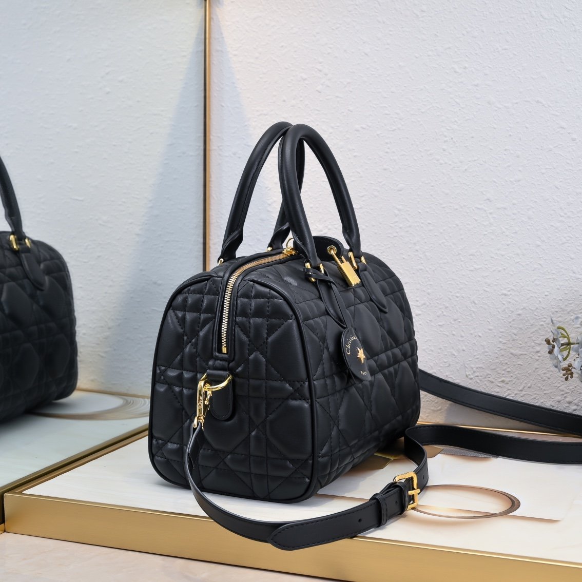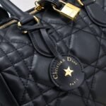 This Dior Groove .25 handbag, part of the winter ready-to-wear collection designed by Maria Grazia Chiuri, is both elegant and stylish. Crafted from blue Oblique-patterned fabric, it features a leather key pouch adorned with the Christian Dior Paris logo and embellished with gold-tone star accents. The key opens the zip-lock closure, and the spacious compartment includes a slip pocket and a zip pocket, perfect for storing daily essentials. It comes with a leather top handle and an adjustable, detachable shoulder strap, allowing you to carry it by hand, over the shoulder, or crossbody, making it ideal for everyday looks. The zip closure is complemented by a lock engraved with the Christian Dior Paris logo. The leather key pouch, featuring the Christian Dior Paris logo and vintage gold-tone metal stars, comes with a key. Large size: 25 cm.