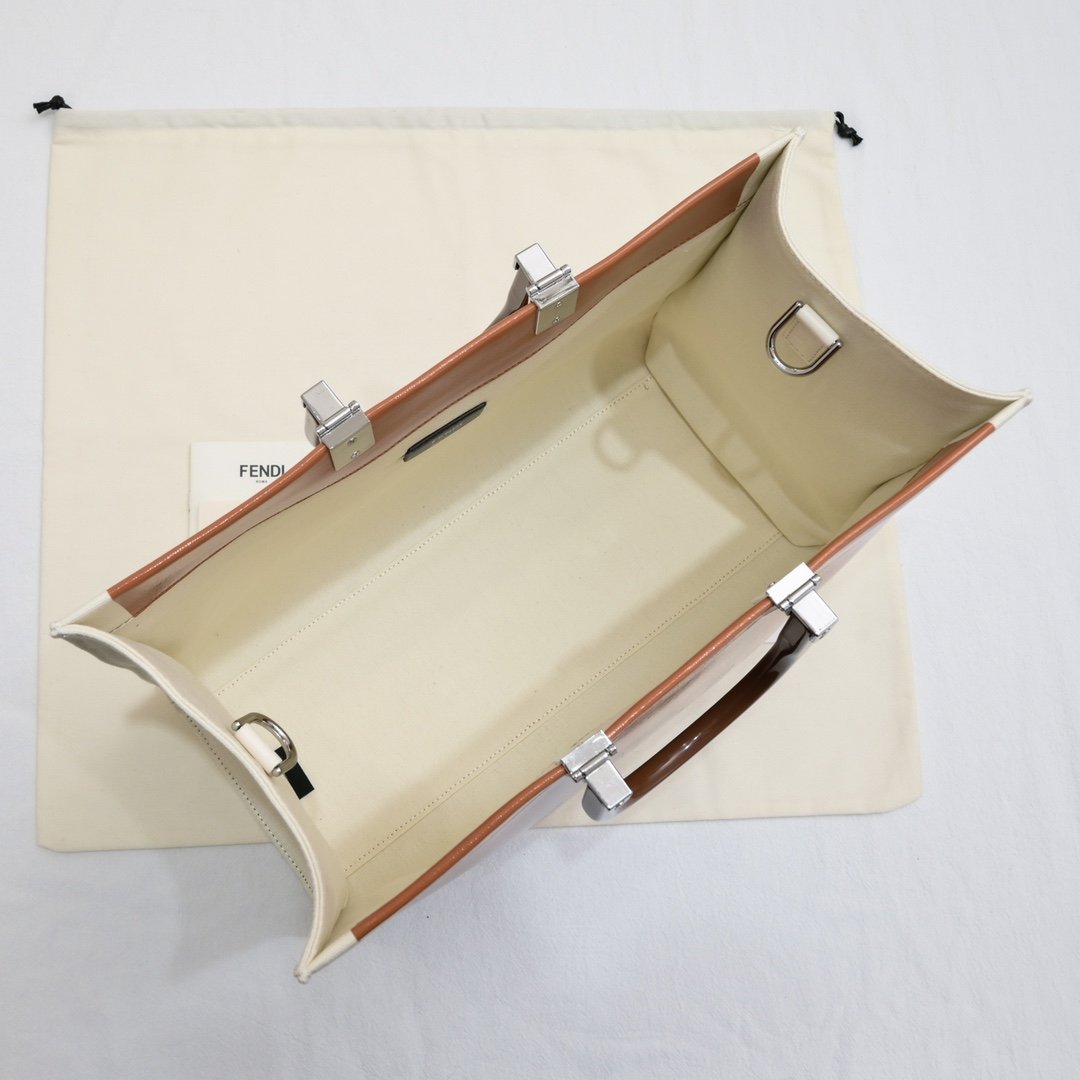 Model 4403 is in stock again: Sunshine medium handbag, patent leather material, engraved with FENDI ROMA letters showing natural canvas lining. Brown plexiglass hard handle FÉŃĎI TOTE tote bag “Sunshine handbag” simple letter LOGO design! Just holding it gives a great aura and doesn’t hurt the hand. The overall retro feeling is extremely strong. It is very suitable for fashionistas who like retro style. Highly recommended hard goods. 💥