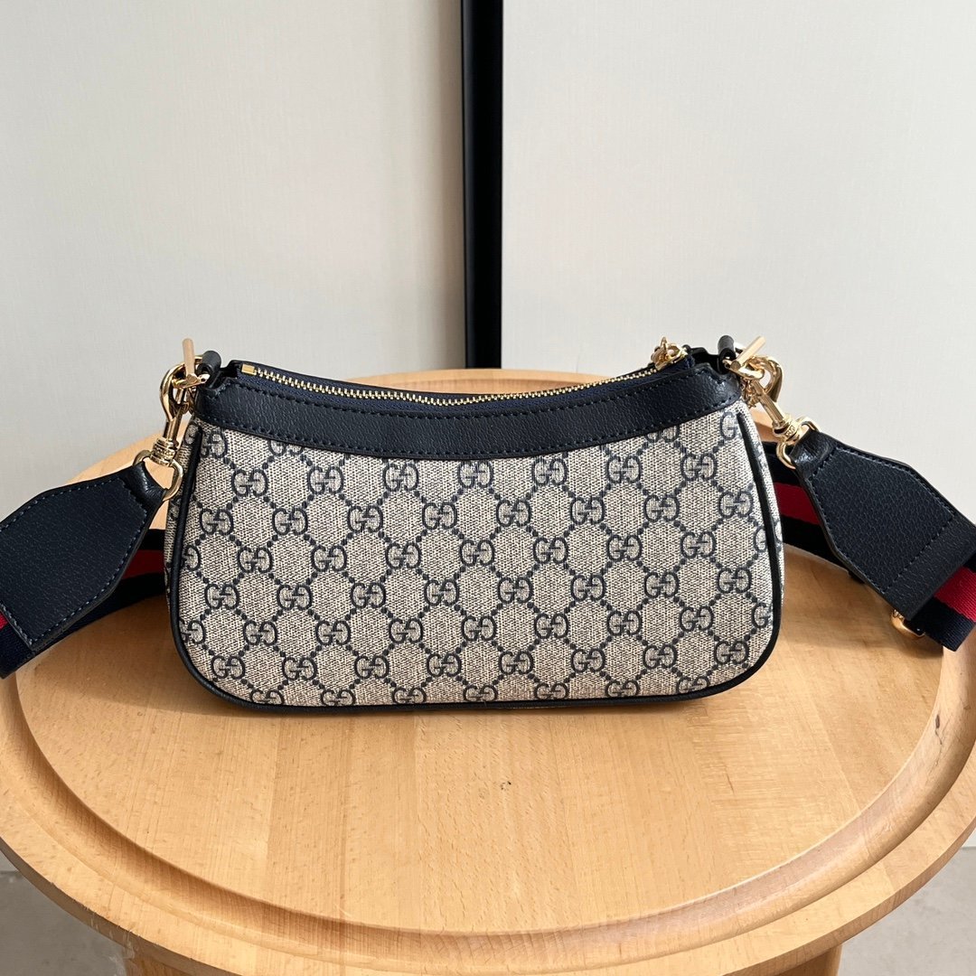 With double shoulder straps. The double G zipper without strawberry is very cute.