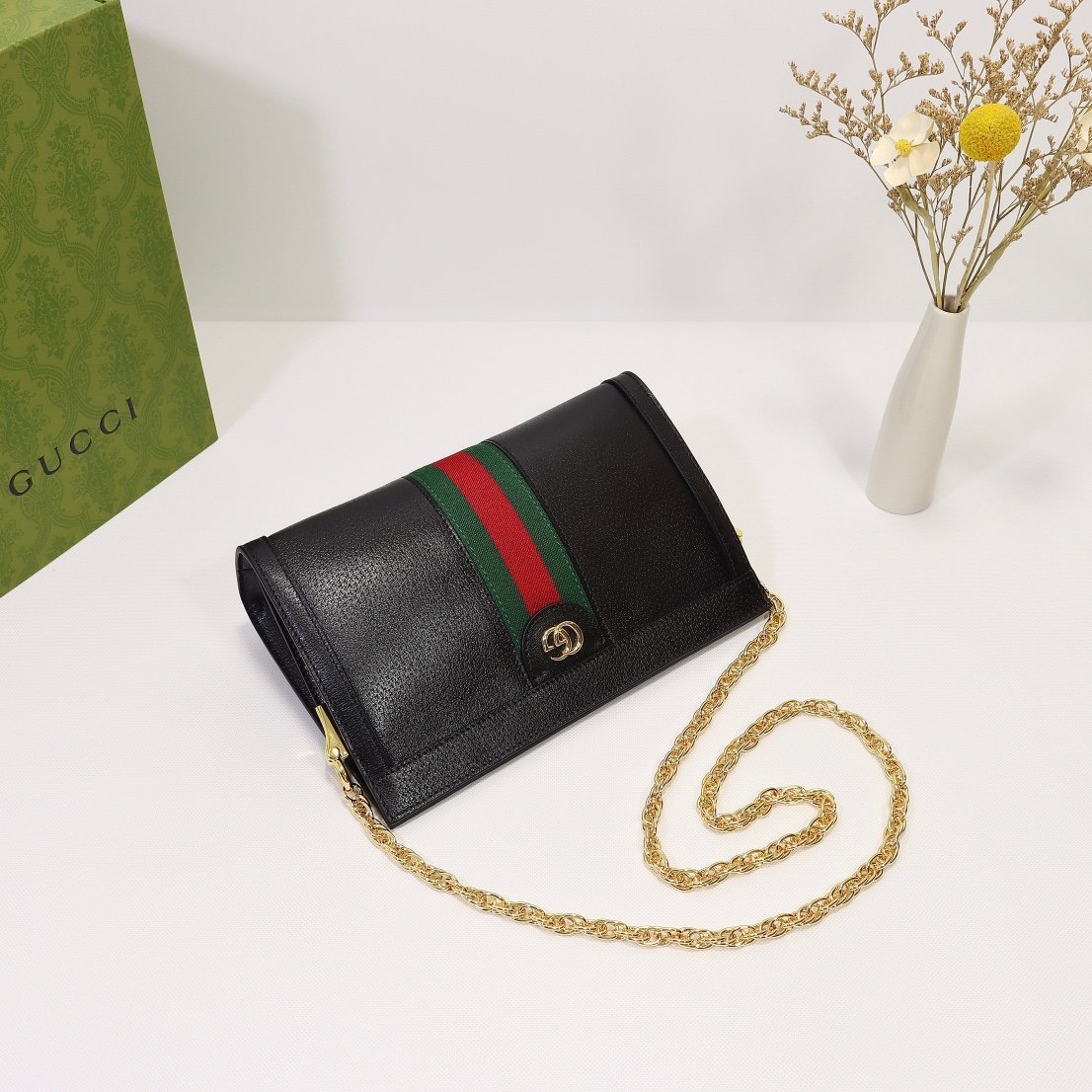 Upgraded version ❕ G home Ophidia series with inlaid webbing striped details for vintage style design. Structural shape, securely closed with magnetic buckle, leather piping, decorative collection details – double G accessories. Model: 503820 Color: brown leather/PVC, size: 26x17x8cm Details GUCCI