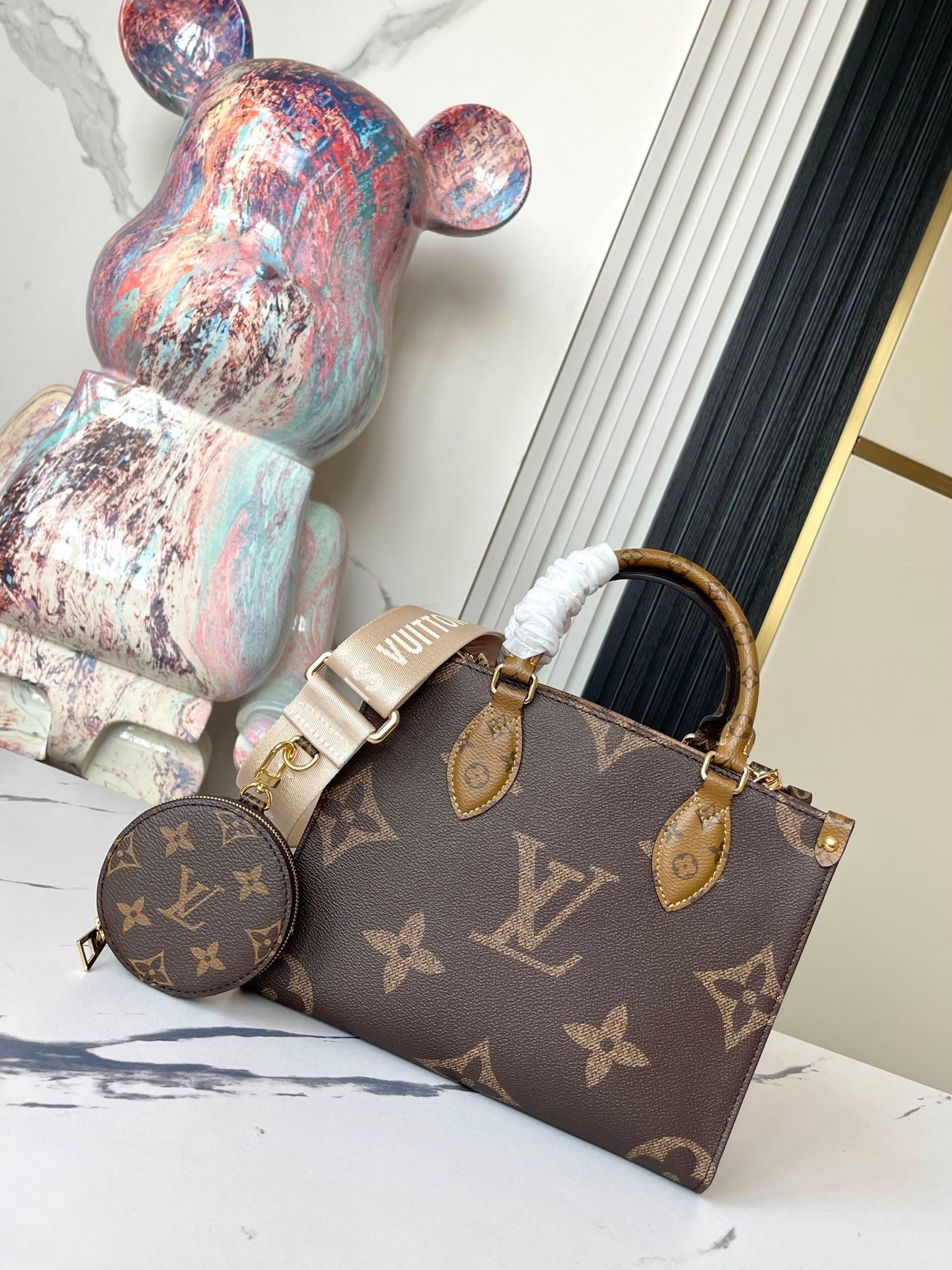 M46373 vintage, Mommy bag series. This OnTheGo small handbag combines Monogram and Monogram Reverse canvas, and the Monogram Giant pattern is embellished on it. The Toron handle and the jacquard woven shoulder strap decorated with the brand’s inscription create a visual contrast. The detachable change purse is suitable for storing change or small delicate items. With both fashionable charm and diverse functions, it becomes an excellent daily companion. 25.0 x 19.0 x 11.5 cm.