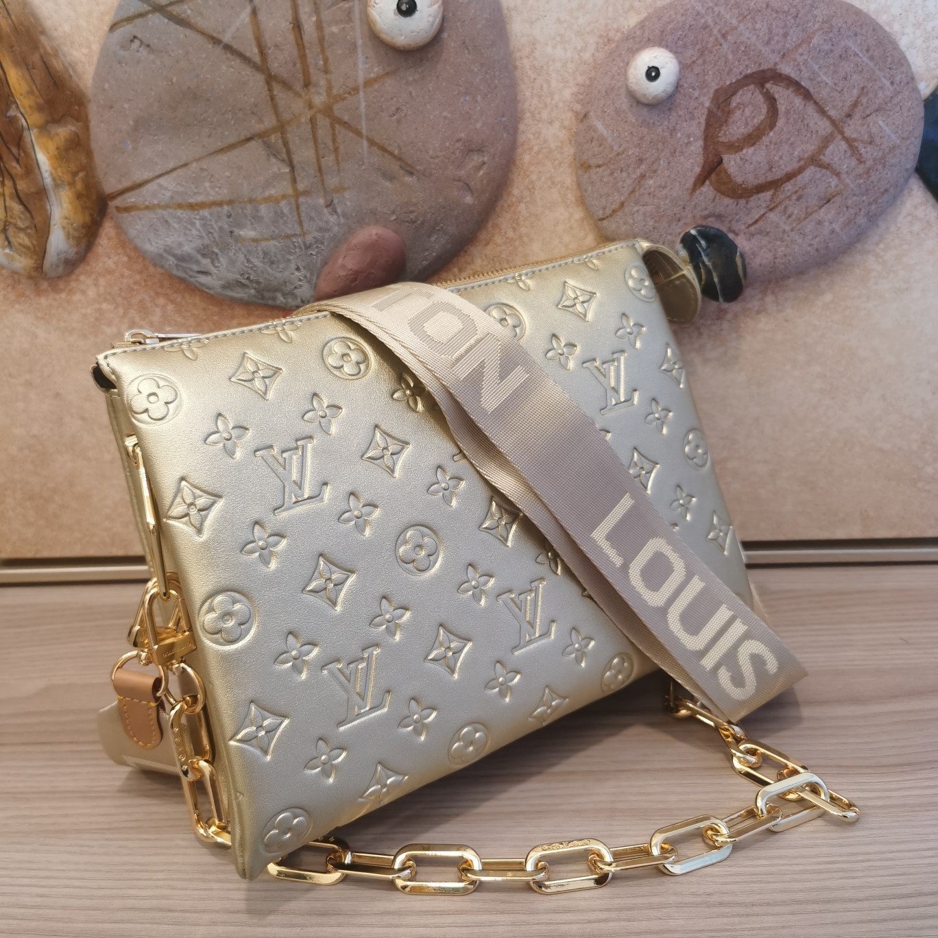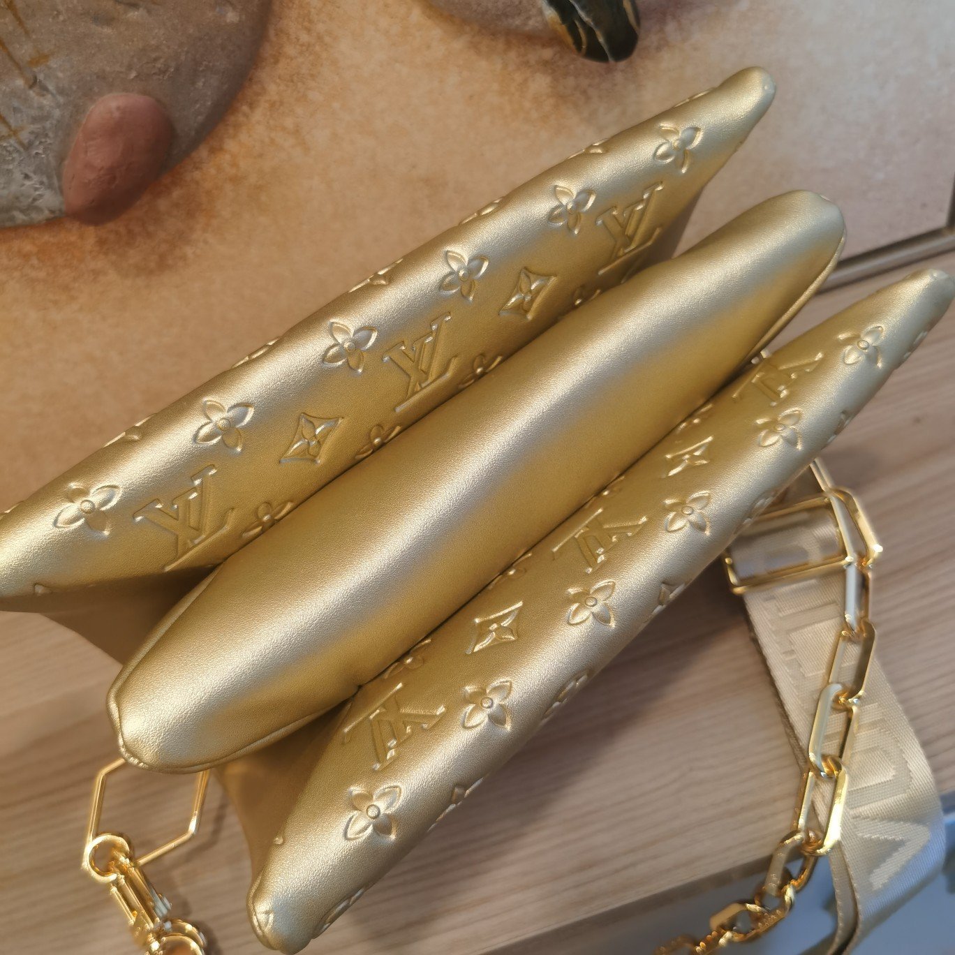 The top-of-the-line original M57793 57790 apricot Coussin small handbag shines at the Spring/Summer 2021 fashion show. Monogram embossed fluffy sheepskin creates a pillow configuration that injects avant-garde style into the minimalist design. Can be carried under the arm with a strap crossbody or an avatar chain baguette bag. Dimensions: 26 x 20 x 12 cm