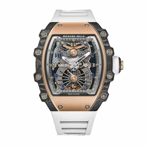 The Richard Mille RM011 Romain Lotus F1 Rose Gold NTPT Carbon Replica is a luxurious watch with a unique design. The watch features an automatic movement with a 7750 caliber and a power reserve of 60 hours. It is certified within COSC limits for precision and has a sweep motion second hand. The case is made of carbon and is black in color. with a carbon bezel of the same color. The crystal is sapphire and the size is 50.00 mm. The bracelet is made of rubber and is adjustable for all sizes. with a 904L stainless steel double-fold clasp.
