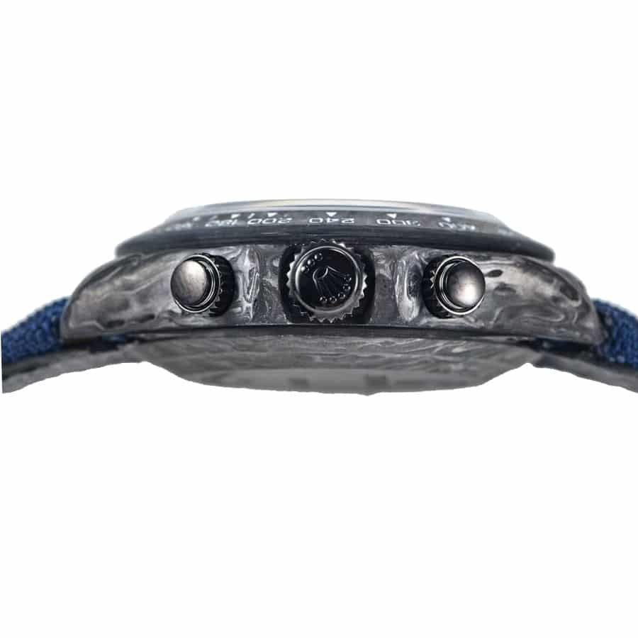 With its robust yet sleek 40.00 mm size and 15.40mm thickness. the Daytona Cosmograph fits comfortably on your wrist. while its scratch-resistant sapphire crystal ensures lasting clarity and protection. The fabric bracelet. designed for all sizes. wraps snugly around your wrist. secured by a 904L stainless steel deployment clasp in matching forged carbon color. As you tighten the clasp. you’ll notice the intricate color fish pattern dial with stick and dot indices come into clearer view. a unique design that sets this replica apart from generic copies.