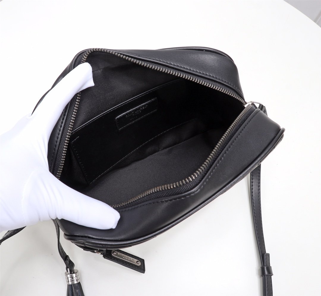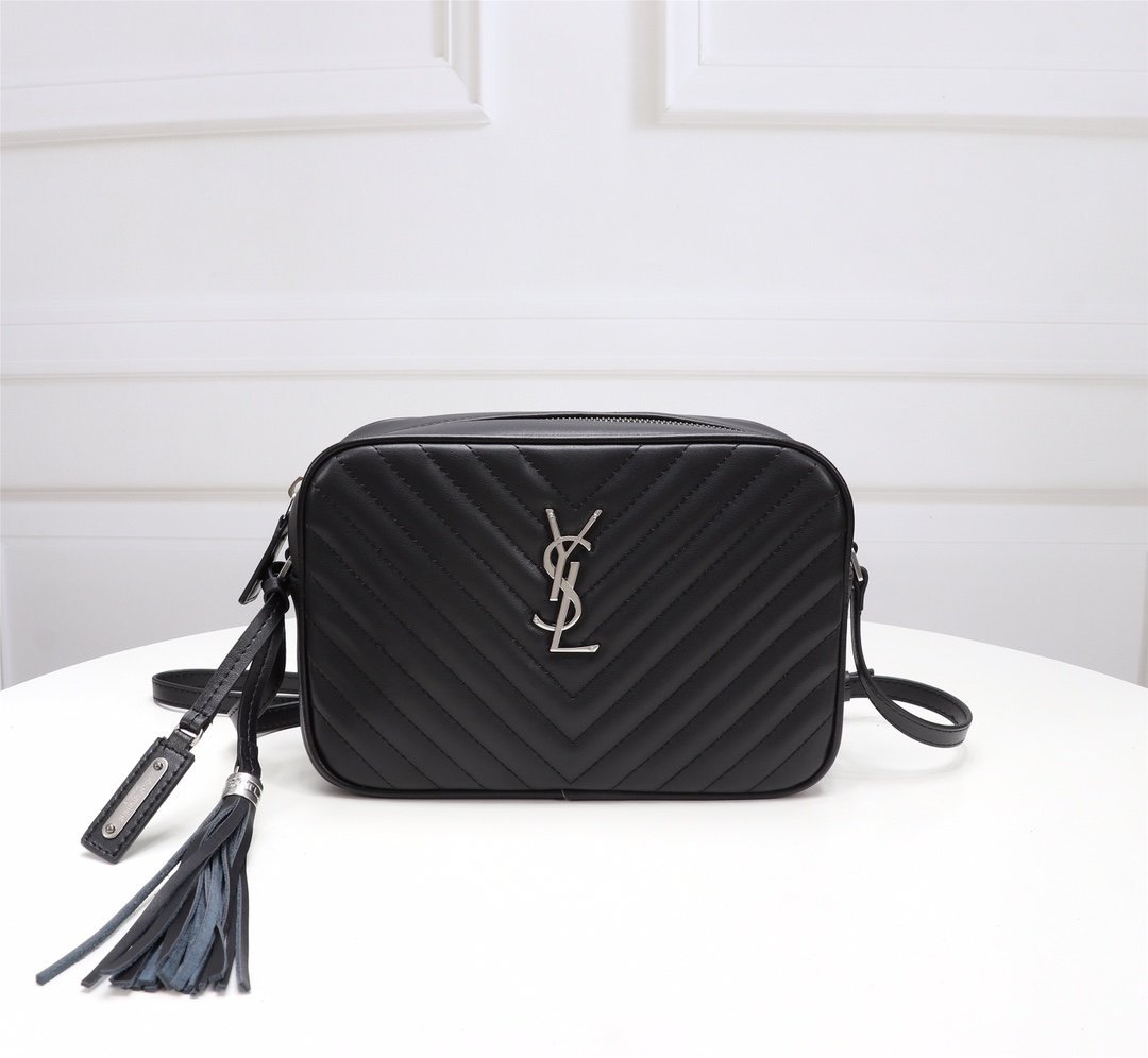 Cowhide with box. Saint Laurent camera bag, very delicate! Adjustable shoulder strap with stylish tassel pendant! Satin lining! There is an inner insert pocket in the bag! Very practical and elegant! Size: 23x16x6cm.
