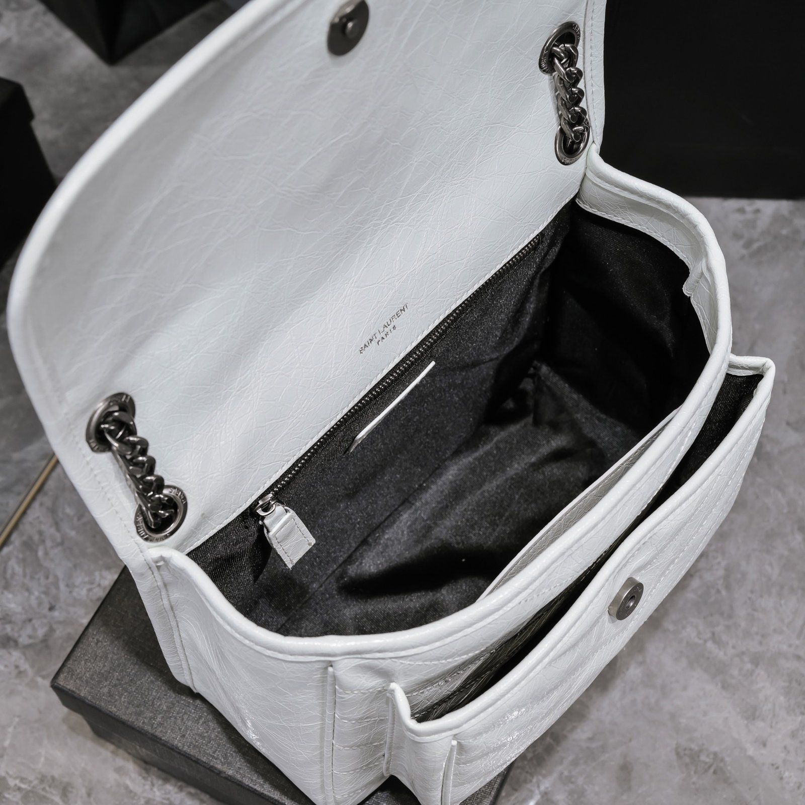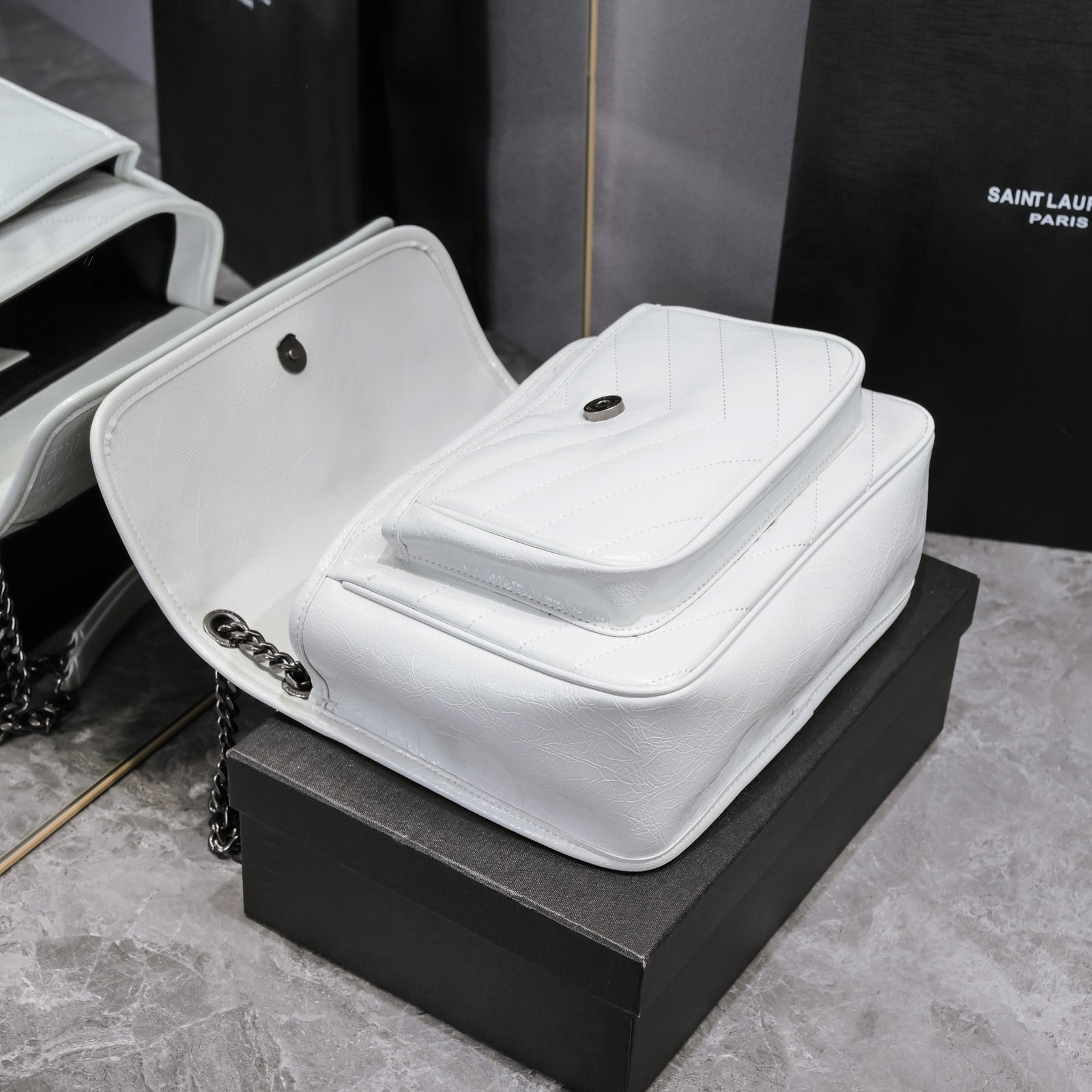 Large Saint Laurent Niki messenger bag – top Italian two-tone baked tar cowhide paired with vintage hardware. The texture and gloss are very unique! The hardware is even more special. The surface of the hardware LOGO is wrapped in cowhide! Two compartments, one zipper pocket, super large capacity! The oiled wax leather of the bag body is extremely soft to the touch and can be bent at will without any problem. Model: 498894. Size: 28x20x8cm.